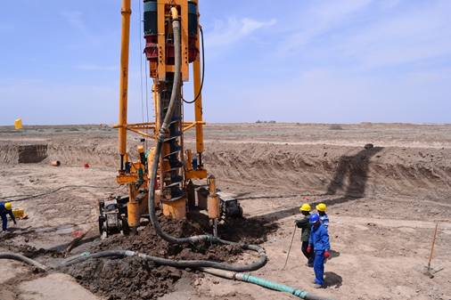 本期工程地處石河子市121團團部東北約1公里處。該場地東西長351米,南北寬約220米。廠址地勢平坦開闊。我單位主要承擔該工程地基處理施工任務,主要包括: 主廠房、冷卻塔、煙囪等部位的降水工程、CFG樁、土方開挖、樁頭破除、褥墊層施工及戈壁料換填任務。公司共完成42929.27m3土方開挖,直徑400mm的CFG樁2868根,約4754.87m³混凝土,6306.71 m3戈壁料換填墊層施工以及全場區的降水工程。