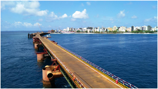 中馬友誼大橋位于馬爾代夫北馬累環(huán)礁(North Malé Atoll),跨越Gaadhoo Koa海峽,連接環(huán)礁上馬累島、機場島(瑚湖爾島)兩個相鄰島嶼,是馬爾代夫重要的島嶼連接線工程。項目起點位于馬累島東南角,順接規(guī)劃Boduthakurufaanu Magu道路,隨后設置橋梁跨越Gaadhoo Koa 海峽,在機場島南段登陸,大橋接線與機場到Hulhumale 規(guī)劃路順接,全橋長度2km,雙向四車道,由橋梁、引堤、道路等工程組成,主橋為主跨180m混合疊合梁連續(xù)鋼構橋,引橋為蓋梁混凝土預制梁橋。項目采用中國公路工程規(guī)范標準,設計使用壽命100年。
