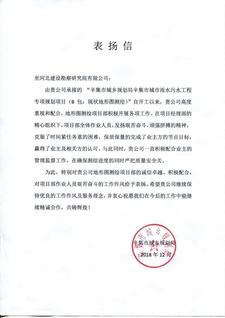 近日,公司收到辛集市城鄉規劃局和任丘市城鄉規劃局發來的表揚信,分別對我公司誠信卓越、積極配合及項目部作業人員艱苦奮斗的工作作風給予表揚。特別是在任丘地下管線普查項目中,在以蓋忠奎、榮亮為代表的項目部精心組織下,項目全體作業人員,發揚艱苦奮斗、頑強拼搏的精神,不斷攻堅克難,保質保量提前完成了生產任務,贏得了業主的認可。甲方特發來表揚信,對我公司所作出的貢獻表示感謝!并希望我們繼續保持優良的工作作風及服務理念,精誠合作,共創輝煌!