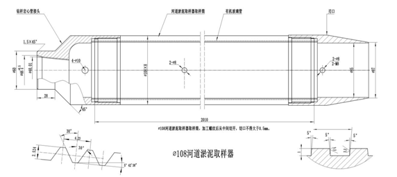 白洋淀采蒲臺區域Φ108河道淤泥取樣器是將高強度玻璃管置入到半合管式薄壁取樣器中,Φ108×8半合管式取樣器內經為Φ92,高強度玻璃管規格為Φ91×2。半合管將高強度玻璃管牢牢地固定在其中,起到很好的保護作用,高強度玻璃管中的淤泥土樣層次分明、清晰可見。