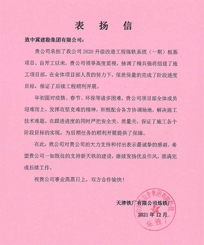 天津鐵廠有限公司煉鐵廠對我公司在疫情期間為確保項目目標迎難而上、攻堅克難的精神表示贊賞,對我公司一如既往的支持和客戶至上的理念表示感謝。中儲糧河北黃驊直屬庫有限公司對我公司的勘察報告、后續驗收服務表示贊許,對公司提供的科學嚴謹、技術精湛、敬業擔當的專業支持和幫助表示感謝。