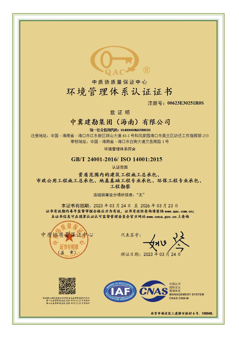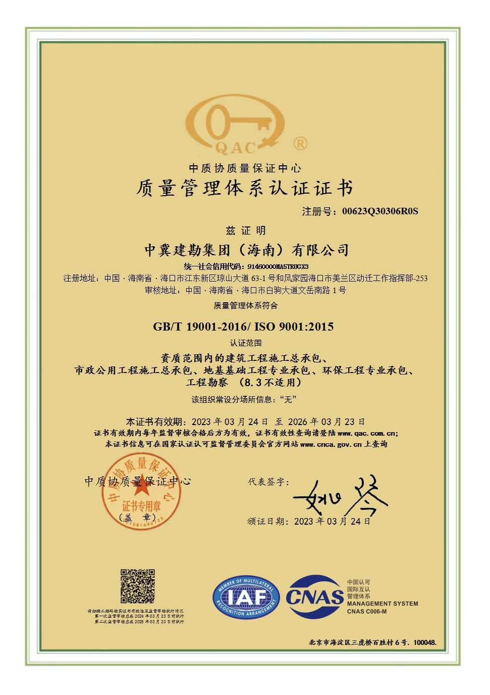 2023年3月13日至18日,經認證機構現場審核,中冀建勘集團(海南)有限公司順利通過了綜合管理體系的認證,并于3月24日取得了中質協質量保證中心頒發的綜合管理體系認證證書。