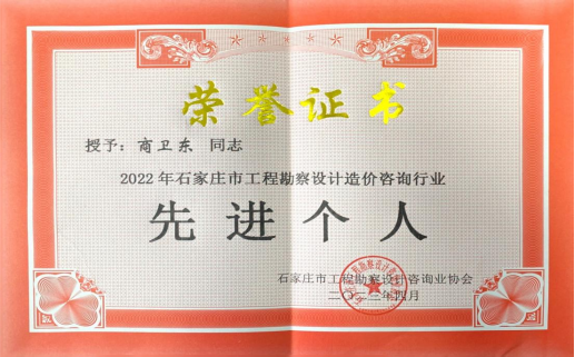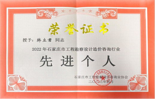 近日,石家莊市工程勘察設計咨詢業(yè)協(xié)會下發(fā)《關于表彰2022年石家莊市工程勘察設計造價咨詢行業(yè)先進單位和先進個人的通知》(石設協(xié)字【2023】2號),我公司被授予“2022年石家莊市工程勘察設計造價咨詢行業(yè)先進單位”稱號,韓立君同志、商衛(wèi)東同志被授予“2022年石家莊市工程勘察設計造價咨詢行業(yè)先進個人”稱號。