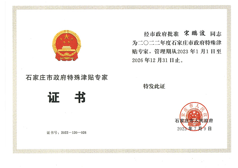 經公司組織推薦,石家莊市人力資源和社會保障局組織評審,社會公示,石家莊市人民政府批準,我公司宋鵬波同志榮獲2022年度石家莊市政府特殊津貼專家。