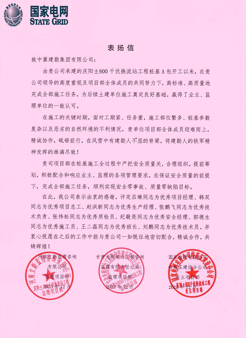 公司收到了國家電網(wǎng)慶陽±800千伏換流站工程由業(yè)主國家電網(wǎng)和監(jiān)理單位河南立新及甘肅光明的聯(lián)合表揚信,表揚信中說在我公司領(lǐng)導(dǎo)的高度重視及項目部全體成員的共同努力下,高標準、高質(zhì)量地完成施工任務(wù),為后續(xù)土建單位施工奠定良好基礎(chǔ),贏得了業(yè)主、監(jiān)理單位的一致認可。在施工的關(guān)鍵時期,我單位項目部全體成員迎難而上,精誠協(xié)作,砥礪前行,在風雪中有建勘人不屈的脊梁,將建勘人的鐵軍精神發(fā)揮的淋漓盡致!