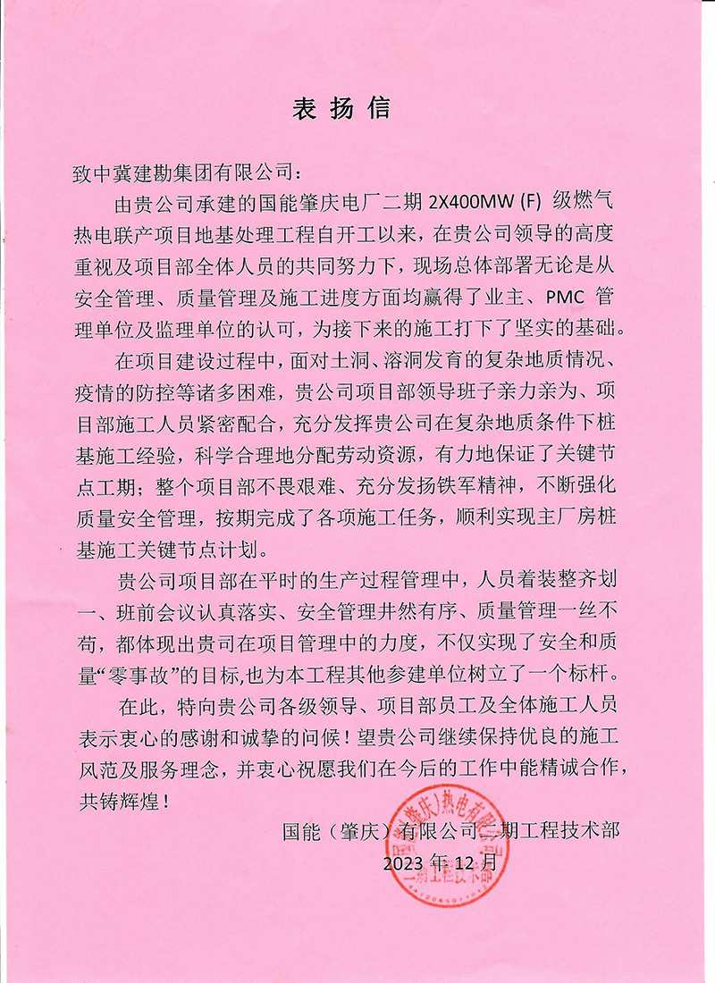 國能肇慶電廠二期2×400MW(F)級燃氣熱電聯(lián)產(chǎn)項目為二期擴建工程,在總公司及領(lǐng)導(dǎo)們的幫助下攻堅克難,面對土洞、溶洞發(fā)育的復(fù)雜地質(zhì)情況、疫情的防控等諸多困難,充分發(fā)揚鐵軍精神,不斷強化質(zhì)量安全管理,積極配合業(yè)主進度計劃,按期完成了各項施工任務(wù)。我單位在安全管理、施工質(zhì)量管理方面為建設(shè)方、PMC管理單位、監(jiān)理方留下深刻影響,為此項目部得到了國能(肇慶)熱電有限公司的高度認可!