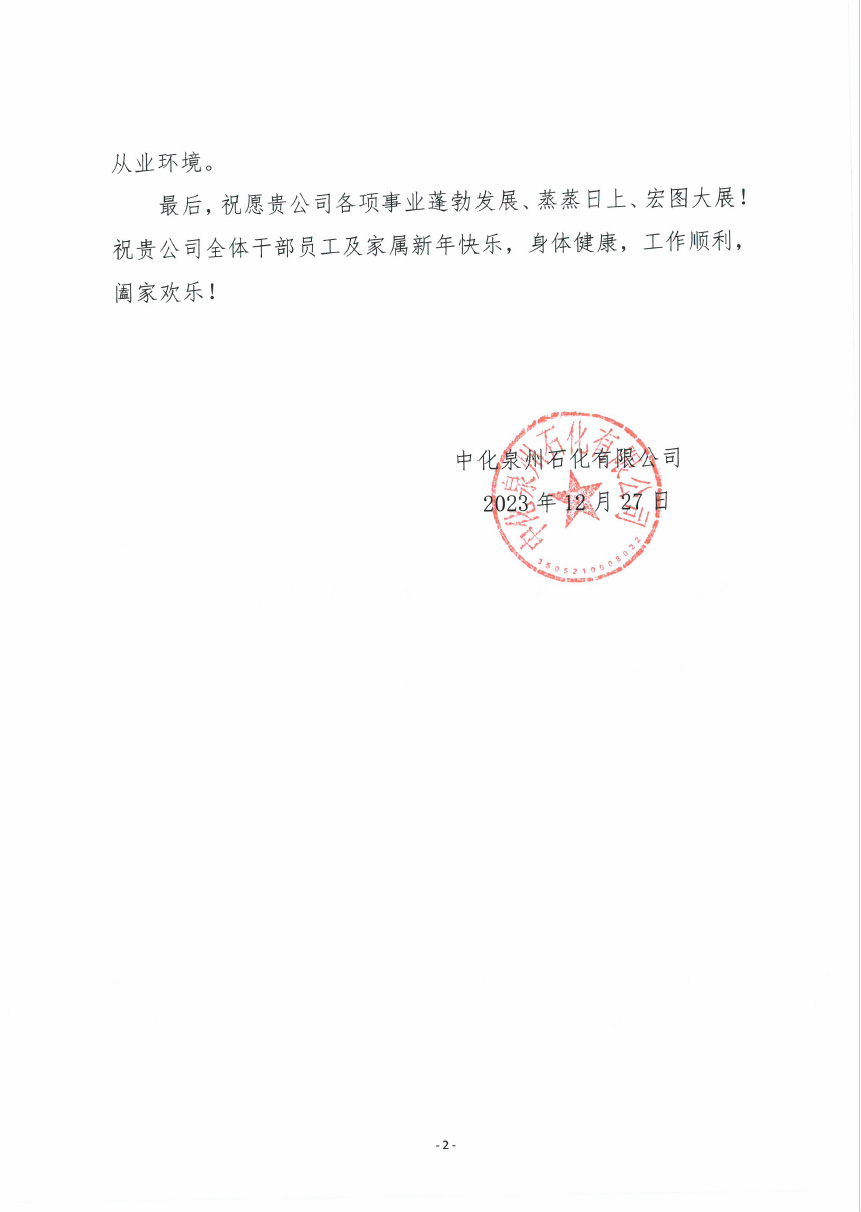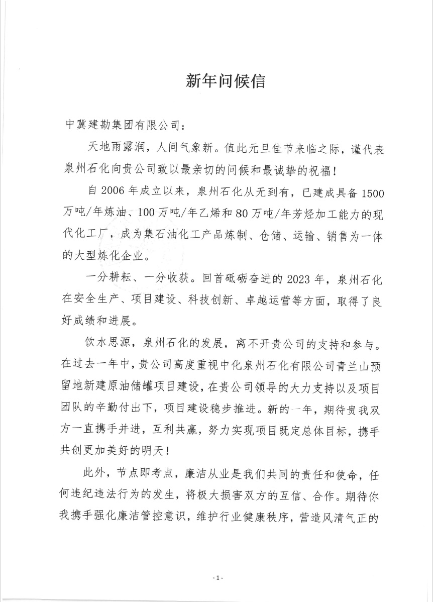 中化泉州石化有限公司為我公司發(fā)來了新年問候信,信中中化泉州石化有限公司肯定了我公司對中化泉州石化有限公司青蘭山預(yù)留地新建原油儲罐項目建設(shè)的重視;看到了我公司及項目施工人員為項目的辛勤付出;并期望在新的一年里加強合作,再創(chuàng)新業(yè)績。