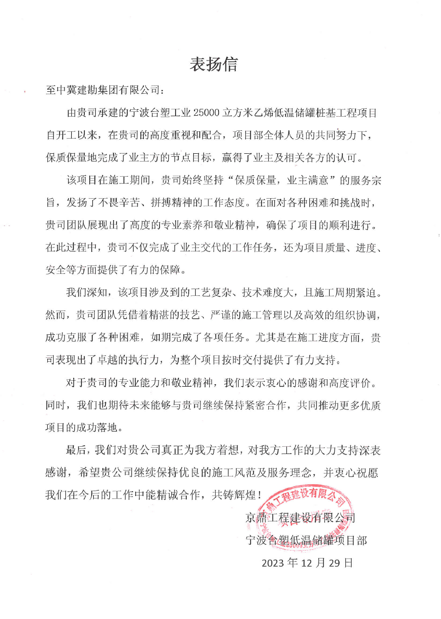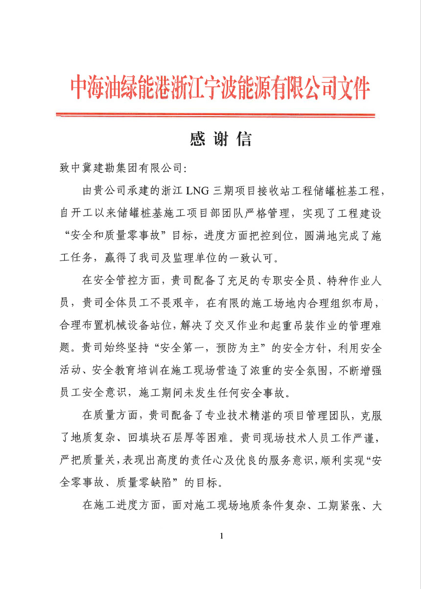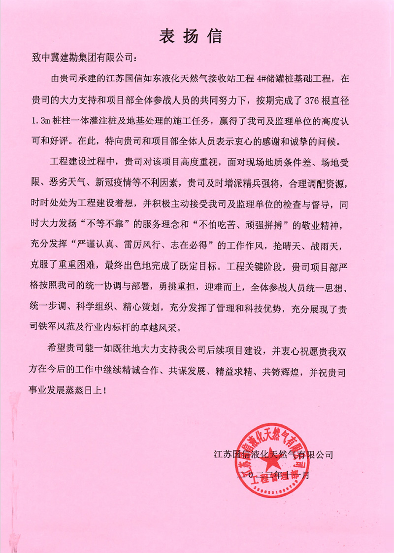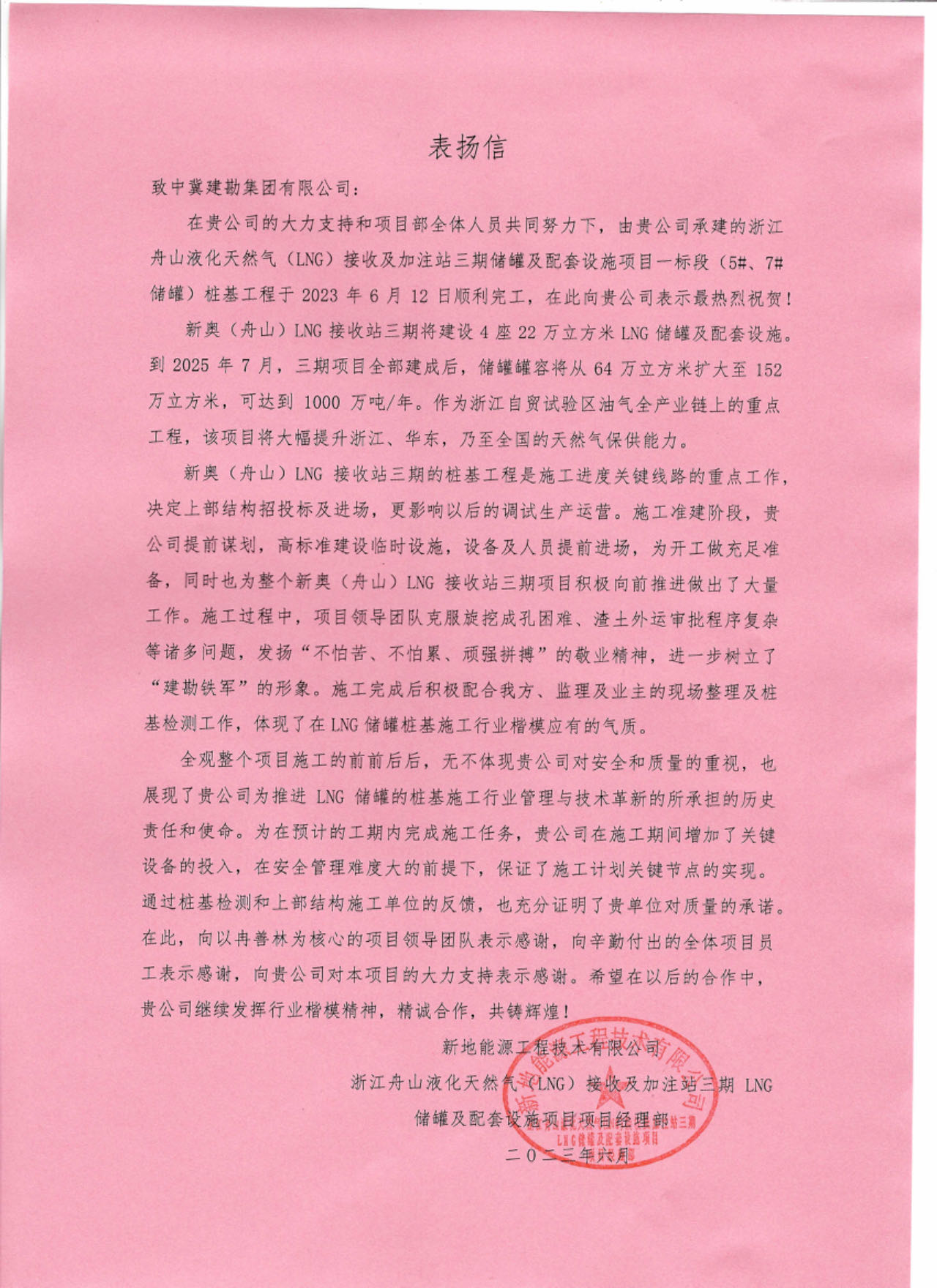 浙江舟山液化天然氣(LNG)接收及加注站三期LNG儲罐及配套設(shè)施項目(5#、7#儲罐樁基工程)于2023年6月25日收到新地能源工程技術(shù)有限公司發(fā)來的表揚信。自開工以來,在公司的大力支持和項目部全體員工的共同努力下,精心組織、全力布局,克服了前期施工任務(wù)重等諸多困難,安全、高效、優(yōu)質(zhì)的完成了儲罐的樁基施工任務(wù),有力保障了本項目總體工期計劃,贏得了監(jiān)理單位和業(yè)主單位的一致認可和好評。