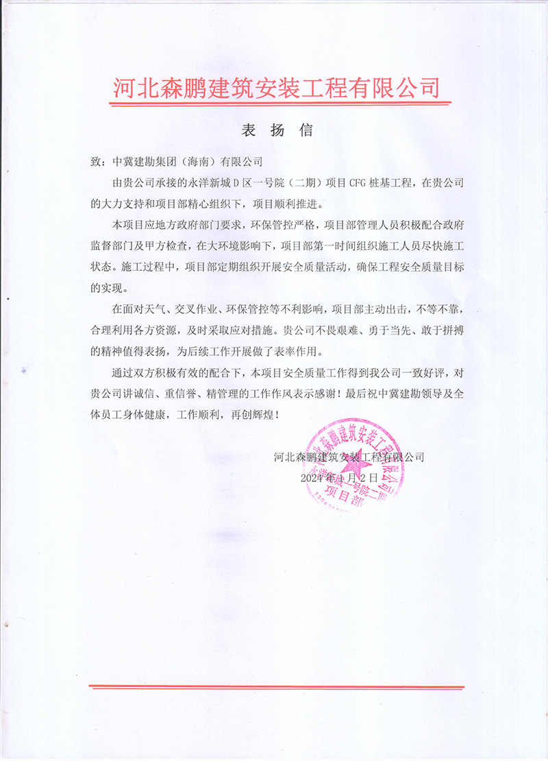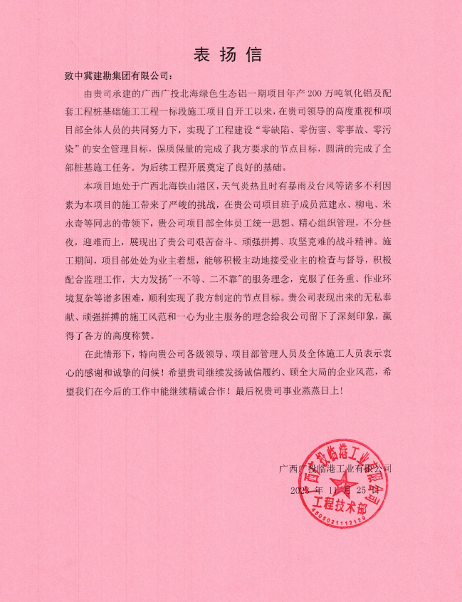 廣西北海氧化鋁項目樁基工程工程自2023年2月24日開工,至12月15日完成合同內(nèi)全部樁基施工任務(wù),在此期間,項目部全體成員一直堅持安全第一的理念,實現(xiàn)了工程建設(shè)“零缺陷、零傷害、零事故、零污染”的安全管理目標,施工過程中克服種種困難,順利實現(xiàn)了業(yè)主方制定的節(jié)點目標,獲得業(yè)主單位的肯定與褒獎,送出表揚信,為主要管理人員頒發(fā)獎狀。為后續(xù)施工工作的開展提供了可靠保障,贏得了業(yè)主及相關(guān)各方的認可。