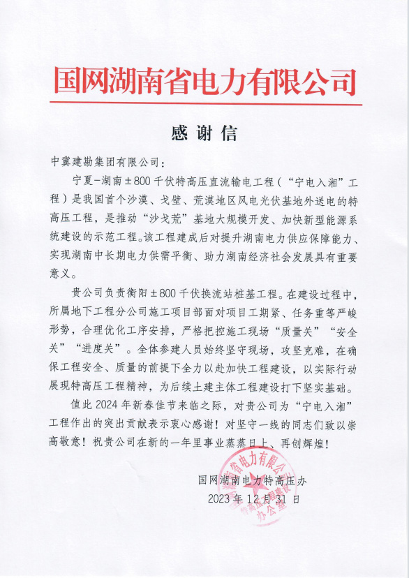 國家電網(wǎng)湖南電力特高壓辦,為我公司承建的衡陽±800千伏換流站工程樁基項目部發(fā)來感謝信一封。感謝信內(nèi)容主要表達了,面對項目的工期緊,任務(wù)重等關(guān)鍵形勢,稱贊我公司能嚴格把質(zhì)量關(guān),安全關(guān)和進度關(guān)。