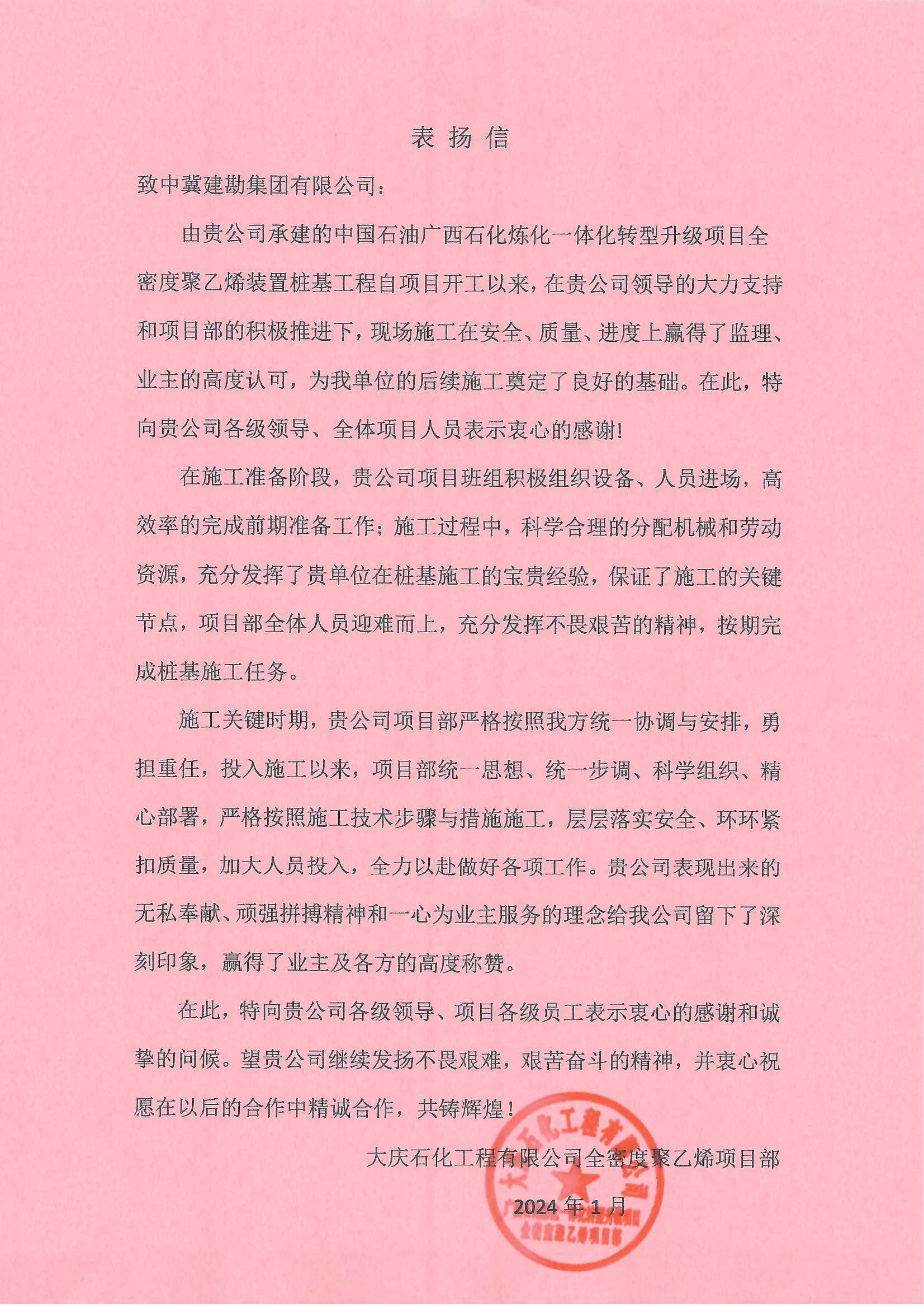廣西石化煉化項目部接收到大慶石化工程有限公司全密度聚乙烯工程建設(shè)部項目經(jīng)理牛家偉發(fā)來的表揚信,信中肯定了我項目部在廣西石化煉化項目樁基工程中所取得的成果。
