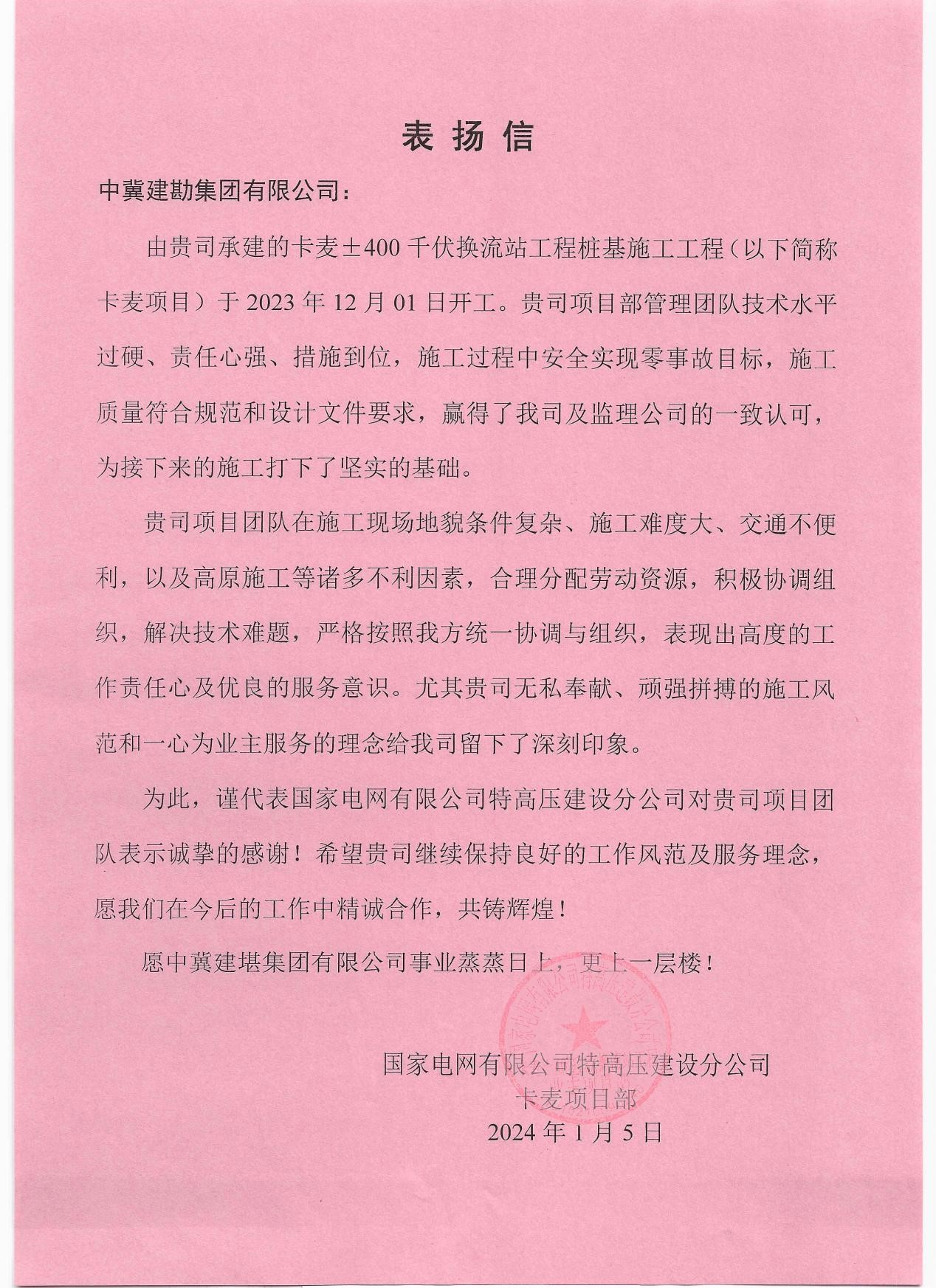 卡麥±400千伏換流站工程樁基施工工程收到業(yè)主國家電網(wǎng)有限公司特高壓建設(shè)分公司發(fā)來的表揚信。項目部敢打硬仗的精神面貌,贏得了業(yè)主方的高度贊賞和認可。