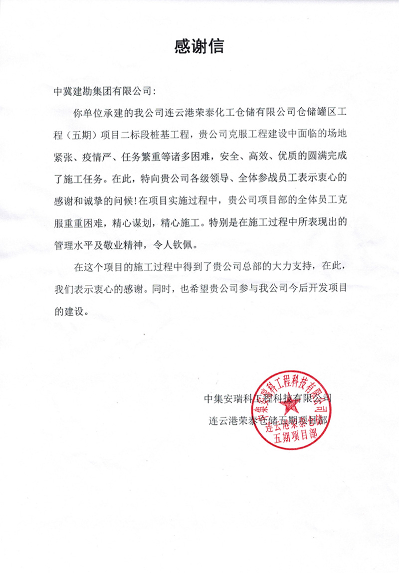 連云港榮泰化工倉儲有限公司倉儲罐區(qū)工程(五期)項目二標段樁基工程,業(yè)主在表揚信中說:貴公司克服工程建設(shè)中面臨的場地緊張、疫情嚴、任務(wù)繁重等諸多困難,安全、高效、優(yōu)質(zhì)的圓滿完成了施工任務(wù)。貴公司項目部全體員工克服重重困難,精心謀劃,精心施工。特別是在施工中所表現(xiàn)出的管理水平及敬業(yè)精神,令人欽佩。