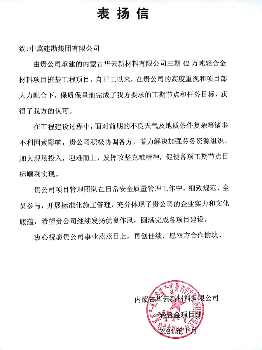 內(nèi)蒙古華云新材料有限公司三期42萬噸輕合金材料項目樁基工程,在工程建設(shè)過程中,面對前期的不良天氣及地質(zhì)條件復(fù)雜等諸多不利因素影響,積極協(xié)調(diào)各方,著力解決加強勞務(wù)資源組織、加大現(xiàn)場投入,迎難而上,發(fā)揮攻堅克難精神,保質(zhì)保量地完成了工期節(jié)點和任務(wù)目標,獲得甲方的認可。