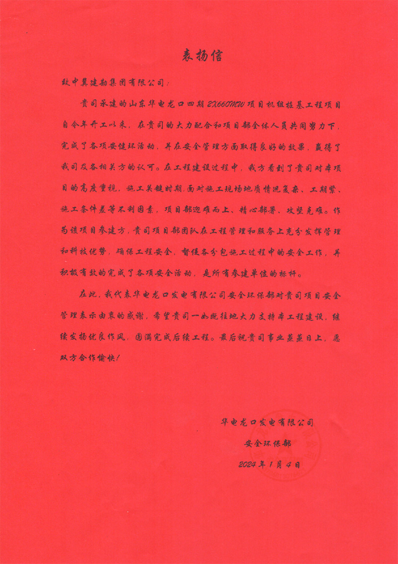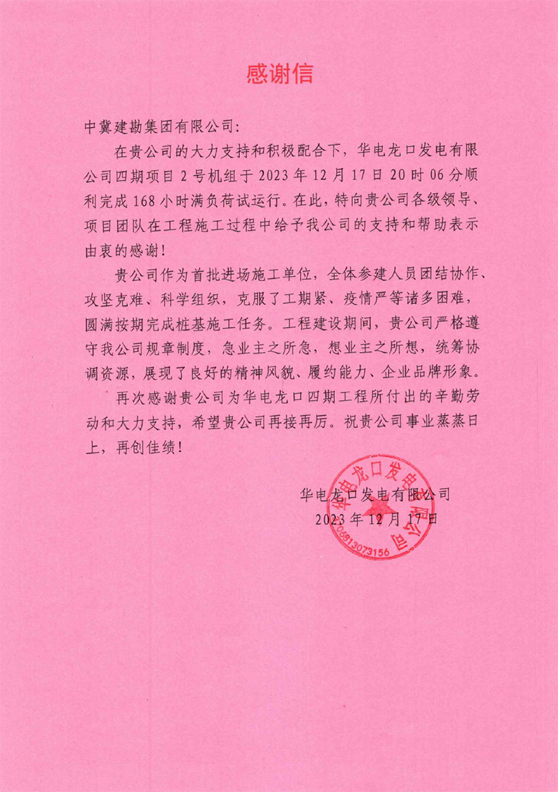 華電龍口發(fā)電有限公司四期項目2號機組于2023年12月17日20時04分順利完成168小時滿負荷試運行。工程建設(shè)期間,完成了各項安健環(huán)活動,并在安全管理方面取得良好的效果,贏得了業(yè)主方認可。我公司人員嚴格遵守我公司規(guī)章制度,急業(yè)主之所急,想業(yè)主之所想,統(tǒng)籌協(xié)調(diào)資源,展現(xiàn)了良好的精神風貌、履約能力、企業(yè)品牌形象。為此,業(yè)主特向我公司各級領(lǐng)導(dǎo)、項目團隊在工程施工過程中給予的支持和幫助表示由衷感謝。