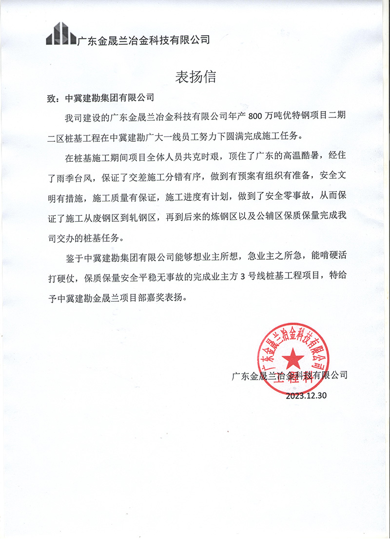 廣東金盛蘭冶金科技有限公司年產(chǎn)800萬噸優(yōu)特鋼項目二期二區(qū)樁基工程,在施工期間項目全體人員共克時艱,頂住了廣東的高溫酷暑,經(jīng)住了雨季臺風,保證了交差施工分錯有序,做到了預(yù)案有組織有準備,安全文明有措施,施工質(zhì)量有保證,施工進度有計劃,做到了安全零事故,保質(zhì)保量的完成任務(wù),業(yè)主對項目給予嘉獎表揚。