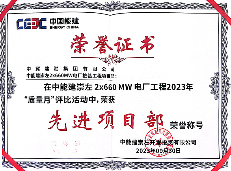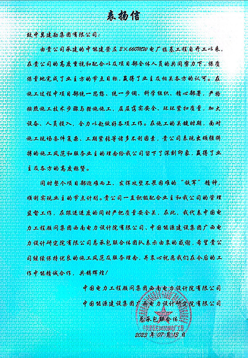 中能建崇左2×660MW電廠樁基工程,在施工過程中,項目部統(tǒng)一思想、統(tǒng)一步調(diào)、科學(xué)組織,精心部署,嚴格按照施工技術(shù)步驟與措施施工,層層落實安全,環(huán)環(huán)緊扣質(zhì)量,加大設(shè)備、人員投入,全力以赴做好各項工作。全體員工以頑強拼搏的施工風范和服務(wù)業(yè)主的理念給我公司留下了深刻印象,贏得了業(yè)主及各方的高度稱贊。