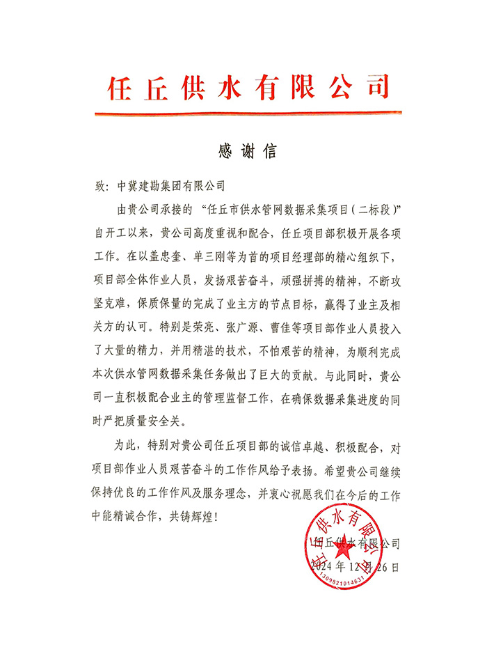 任丘市供水管網(wǎng)數(shù)據(jù)采集(二標(biāo)段)項目,自開工以來領(lǐng)導(dǎo)十分重視,統(tǒng)籌安排,精心組織,項目部全體作業(yè)人員發(fā)揚艱苦奮斗,頑強拼搏的精神,不斷攻堅克難,保質(zhì)保量順利完成了供水管網(wǎng)數(shù)據(jù)采集項目。我公司認(rèn)真負(fù)責(zé)、誠信卓越、一心為業(yè)主服務(wù)的工作精神贏得了業(yè)主的高度認(rèn)可和贊揚,同時對本項目表現(xiàn)突出的工作人員頒發(fā)了“2024年度先進(jìn)工作者”榮譽證書。